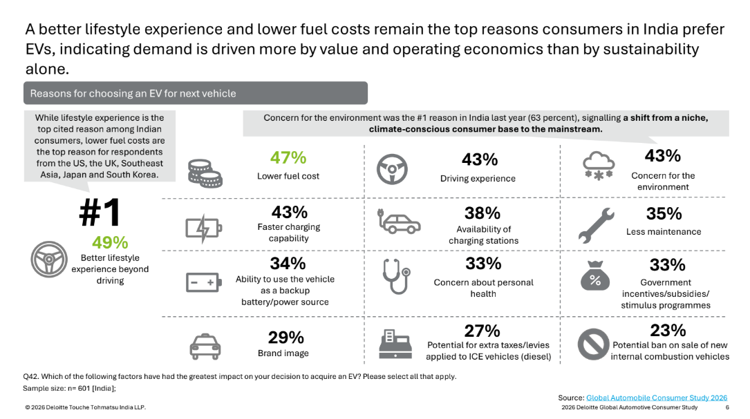 EV adoption in India is progressing at a measured pace, with intent remaining steady rather than accelerating. Ecosystem constraints continue to influence decisions, including concerns around public charging infrastructure (43 percent), charging time (41 percent) and battery safety and lifecycle issues (38 percent).