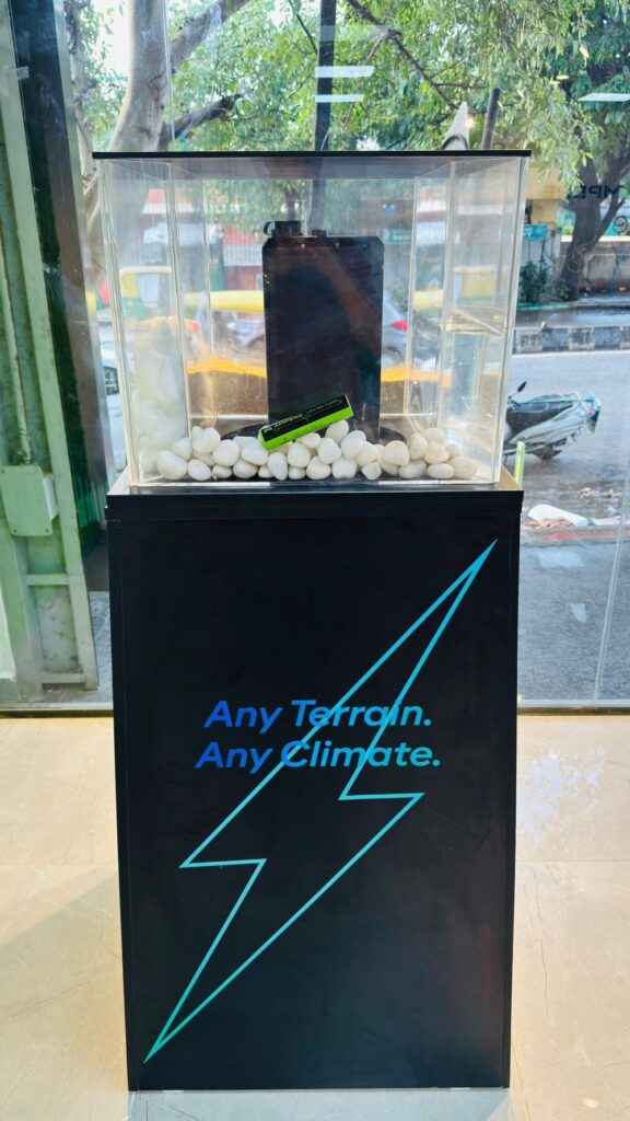 Another standout is the LFP Battery Display Setup, where the brand’s Lithium Ferro Phosphate battery is encased in a transparent cube surrounded by ice, sand, water, and gravel—visually demonstrating Ampere’s aim to offer robust, all-weather performance tailored for India’s varied terrains.