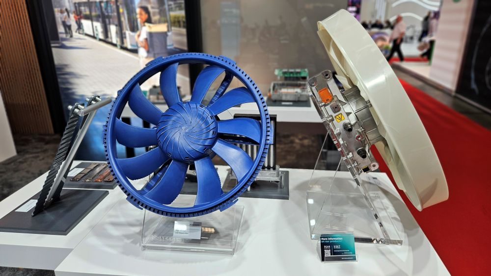 BorgWarner’s booth prominently featured its latest high-voltage electric fans, developed to meet the thermal requirements of buses and heavy-duty trucks. One smaller eFan, designed for bus applications, delivers between 3 to 5 kilowatts, integrating air-cooled power electronics into the rear of the unit. For heavier-duty applications, a scalable eFan with 10 to 20 kilowatts of power was on display, offering flexible deployment across 12.5 to 18.5-meter buses and trucks.