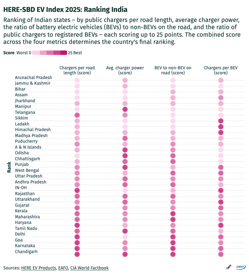 The Index also explains why some States surge ahead while others fall behind. Leaders such as Chandigarh, Karnataka and Goa show a strong mix of supportive policies, faster infrastructure rollout and growing EV adoption. Chandigarh tops the rankings with a score of 87.90, helped by its compact size, dense population and clear zero-emission policies. Karnataka has climbed to second place, balancing rapid EV adoption with relatively better charger availability. Goa leads in EV fleet share, reflecting early consumer acceptance.