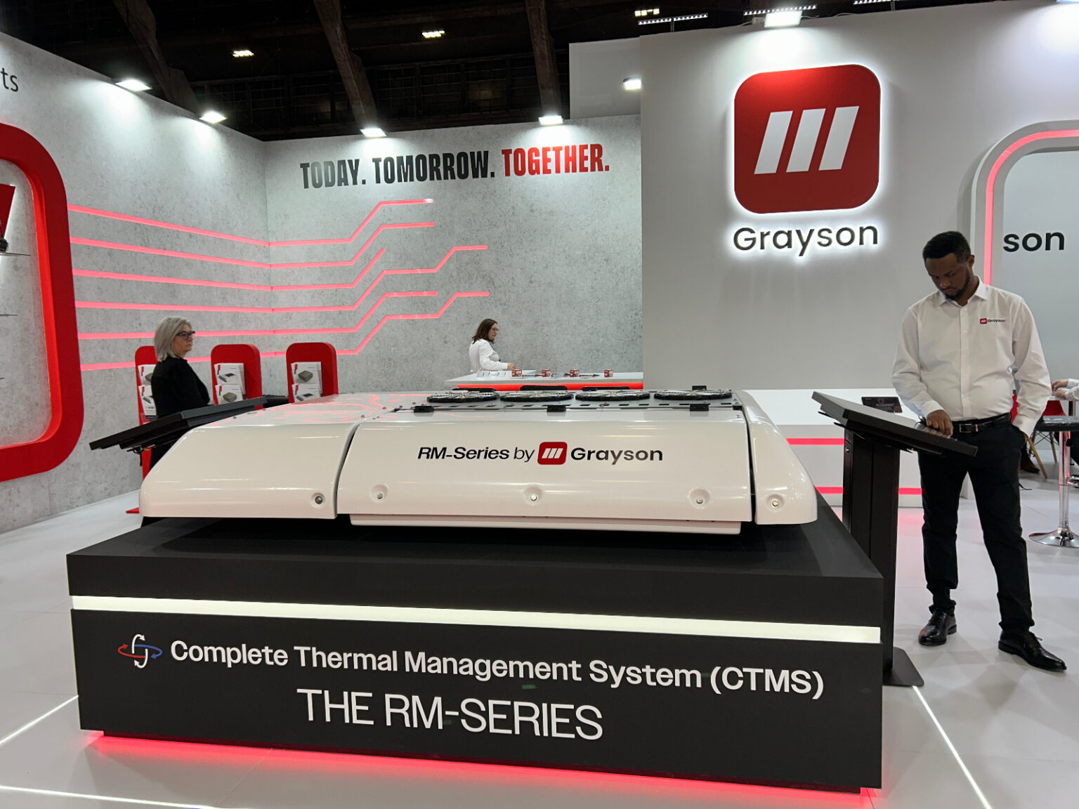 The centrepiece of Grayson’s Busworld display is the CTMS RM-series, a rooftop-mounted, high-voltage system designed for next-generation electric city buses and coaches. The flagship RM2-800V delivers up to 33kW of air conditioning at 40°C ambient, with reversible heat pump technology, waste-heat recovery, active and passive battery cooling, and optional battery heating. Compatible with global markets (LHD and RHD) and operating up to 900V DC, the RM-series offers OEMs a single, scalable platform to handle all vehicle thermal demands for drivers, passengers and powertrain.