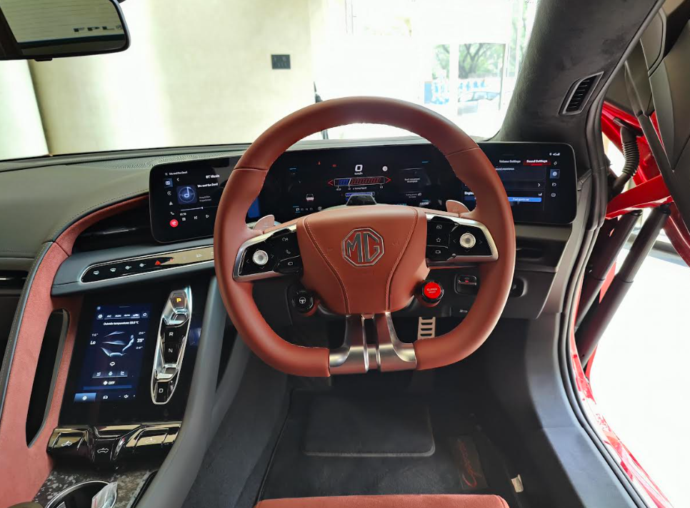 Then came the moment everyone talks about: the doors. The Cyberster is the only car in India with fully electric scissor doors, and they open in a dramatic way that makes people stop and look. Whether triggered from the key fob or the buttons inside, they rise silently and elegantly. You can even adjust the angle and height—something you don’t realise is addictive until you start playing with it. Yet there’s practicality too: a manual override is built in for emergencies.