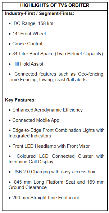The TVS Orbiter offers an intelligent connected riding experience, including: